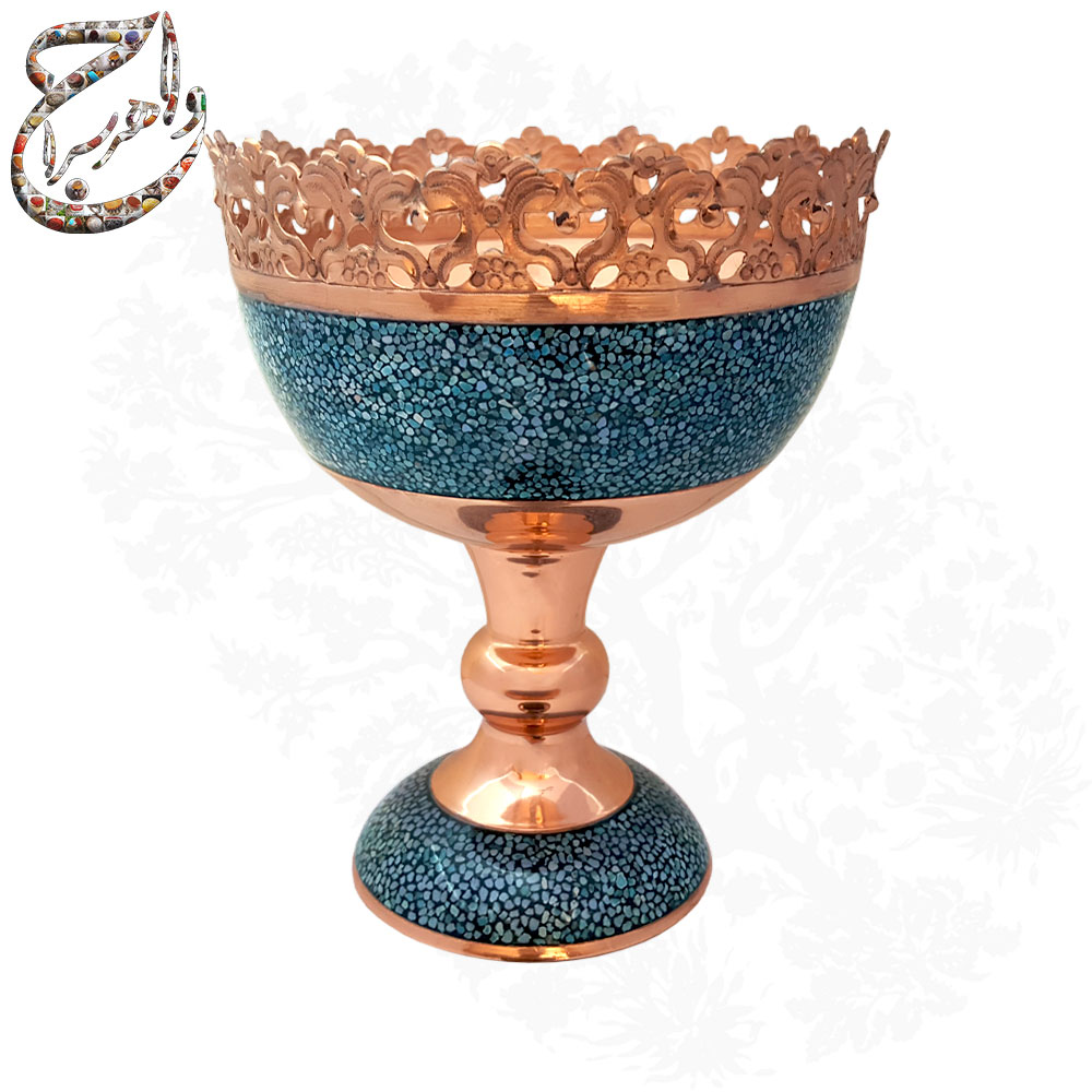 آجیل خوری فیروزه کوبی بر پایه ی مس با دیواره های شبکه ( اره کاری شده ) و کاسه ی قلمزنی شده .
