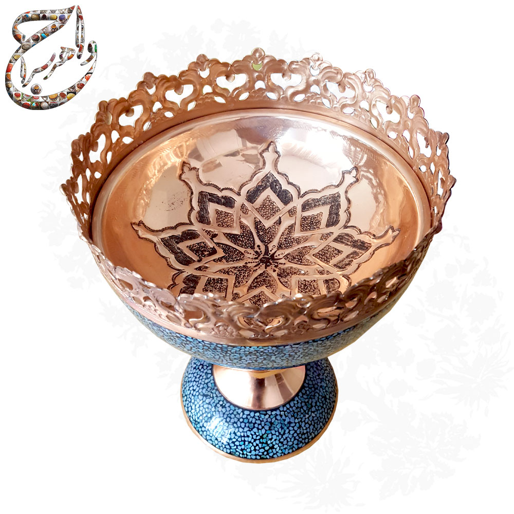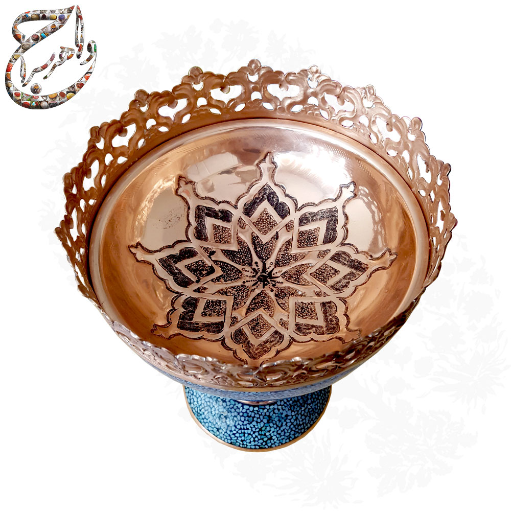 آجیل خوری فیروزه کوبی بر پایه ی مس با دیواره های اره کاری شده و کاسه ی قلمزنی شده .