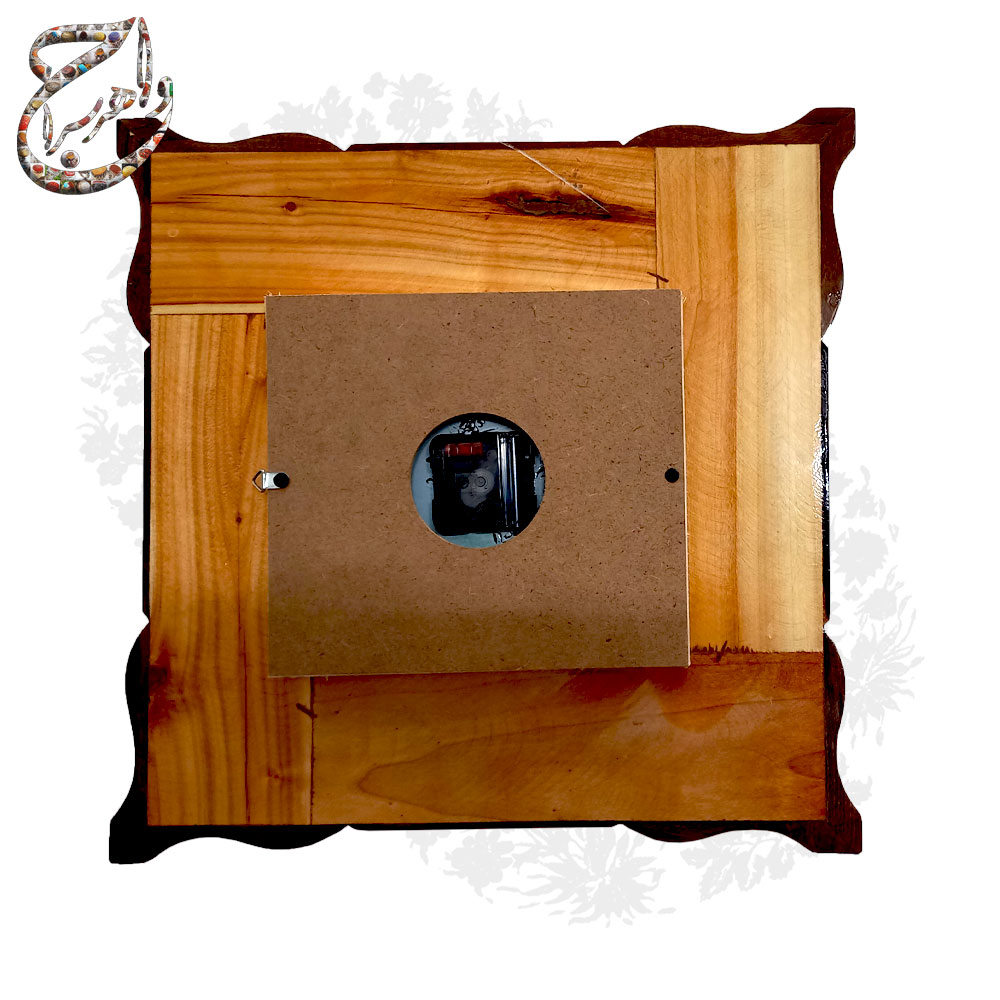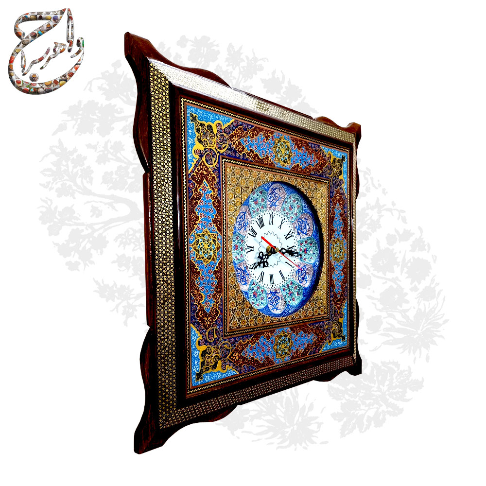 ساعت دیواری مربع مزین به هنر میناکاری روی مس و خاتم کاری ممتاز روی چوب . ابعاد کل ساعت 47*47 سانتی متر و ابعاد میناکاری 25*25 سانتی متر میباشد . این ساعت علاوه بر هنر میناکاری به هنر خاتم کاری ممتاز نیز مزین شده است .