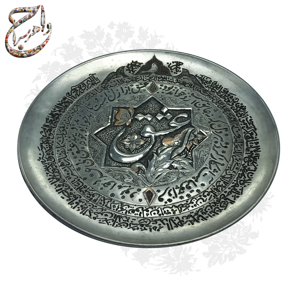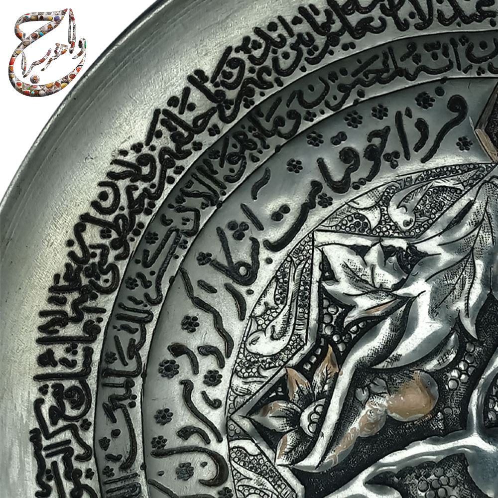 سینی مسی قلمزنی دستی استاد مهدی شمس زنجانی با طرح قلمزنی متنی مزین به و ان یکاد و آیت الکرسی و دو بیت شعر فارسی